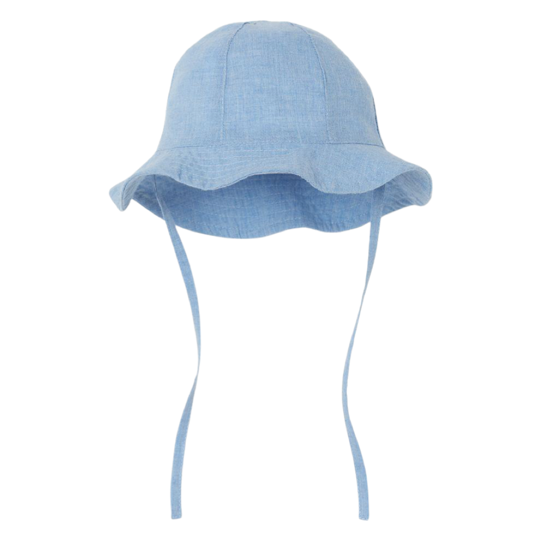 Gorro para el sol en tejido vaporoso de algodón. Modelo con ala ondulada y lazos en la parte inferior forrado.