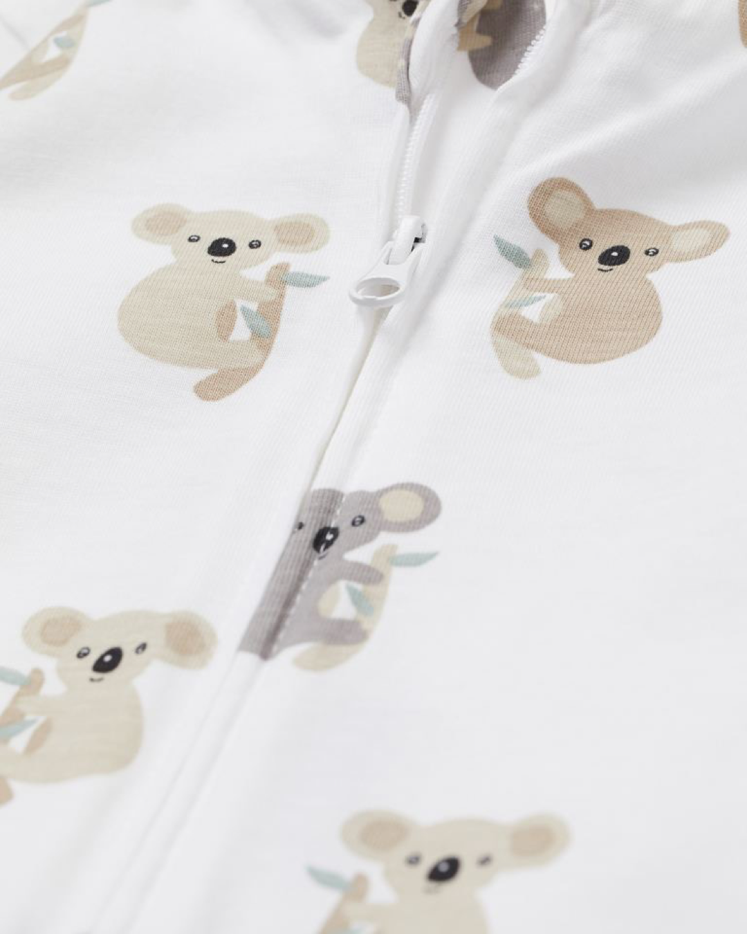 Pijama entero en jersey suave de algodón orgánico con zíper al frente que se extiende por una de las piernas y con protección para la barbilla en la parte superior. Cuello, puños y ruedo en punto elástico.