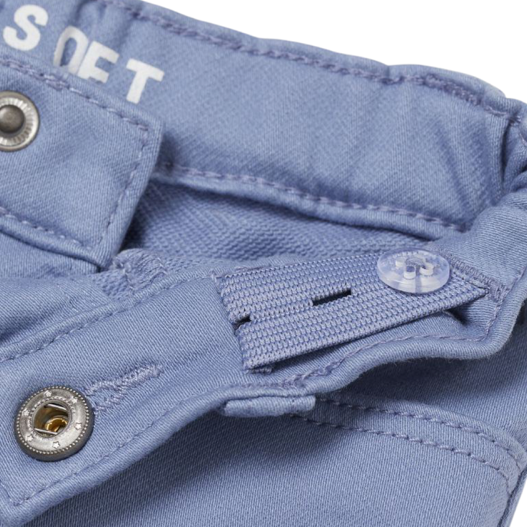 Pantalón de algodón stretch súper suave. Cintura elástica ajustable con botón de presión, cierre decorativo, bolsillos decorativos al frente y bolsillos funcionales en la parte posterior.