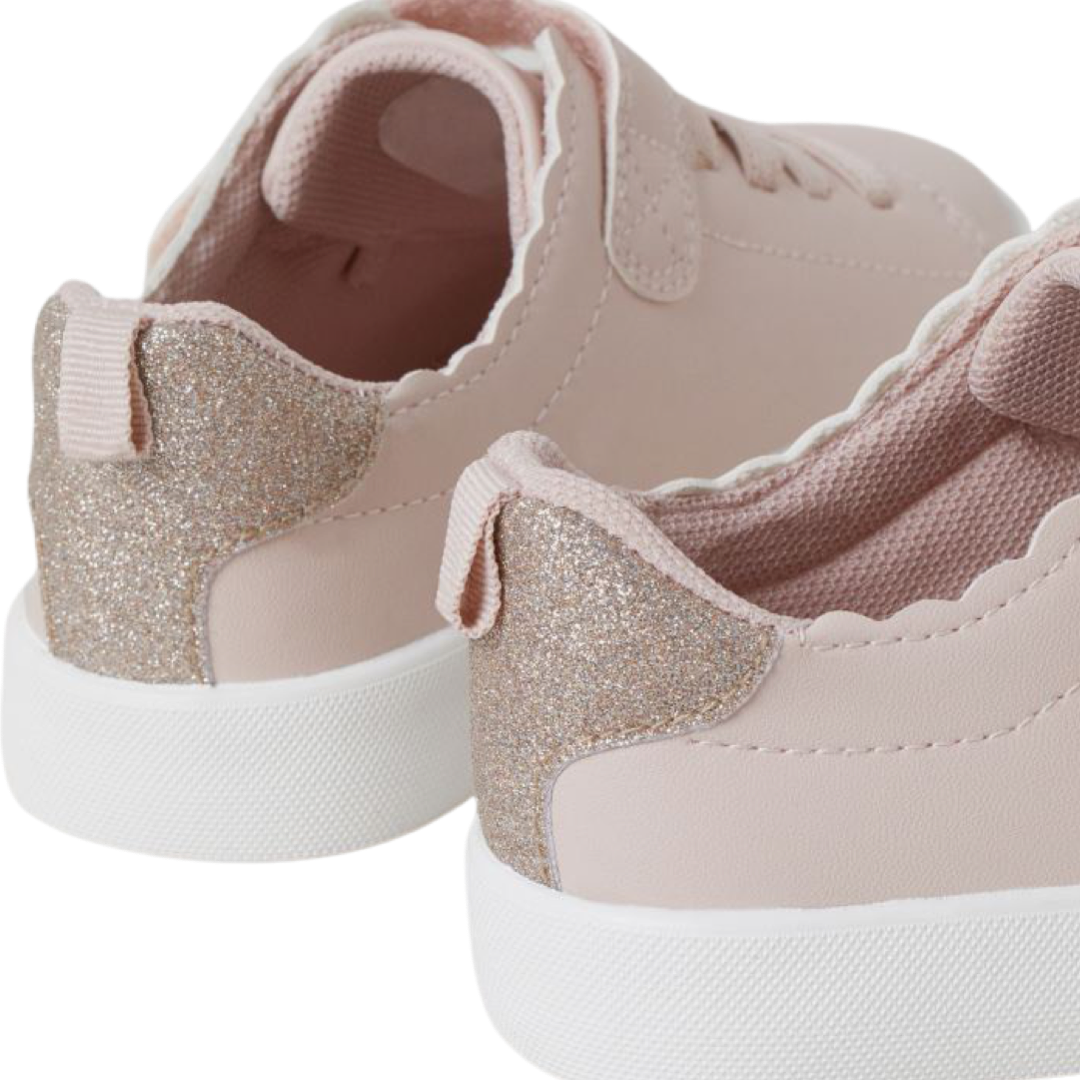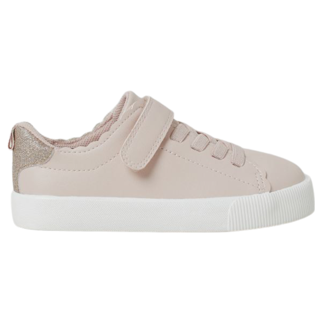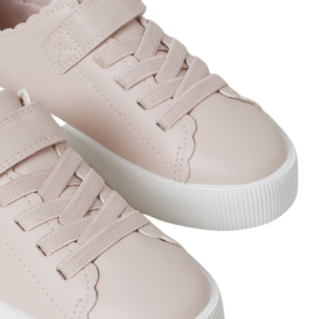 Tenis en piel sintética con agujetas elásticas al frente y trabilla de cierre autoadherente en la sección superior.