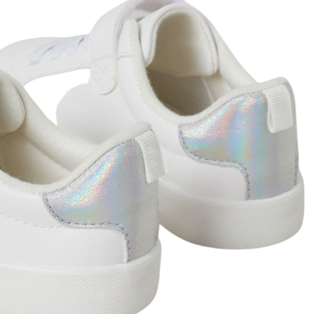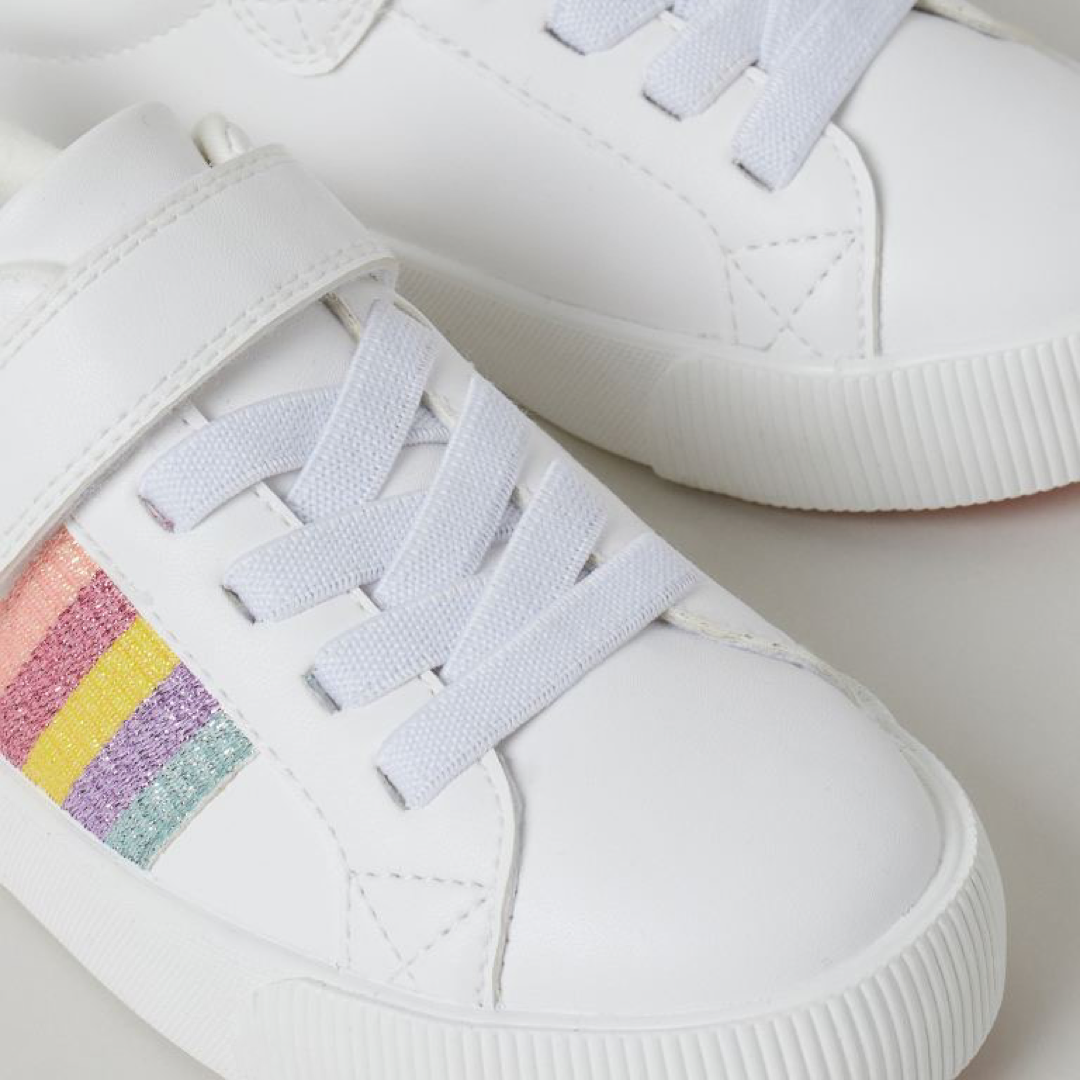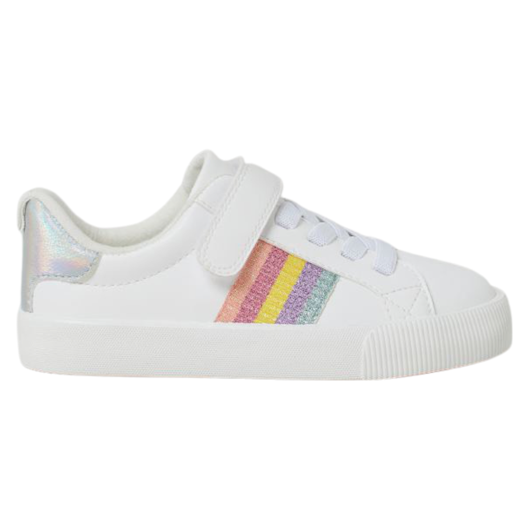 Tenis en piel sintética con agujetas elásticas al frente y trabilla de cierre autoadherente en la sección superior.